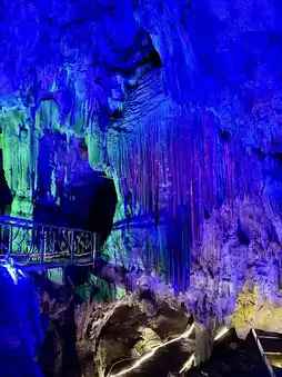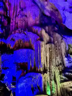 Swallows' Float Cave on the Han River sits nestled among mountains, its entrance resembling the gaping maw of a giant beast, a breathtaking spectacle. Upon entering, the stalactites and stalagmites shimmer under the illumination of colorful lights, creating the illusion of stepping into an underground palace.