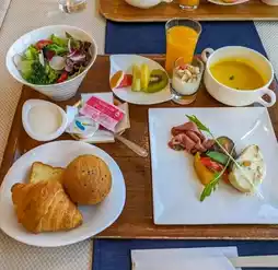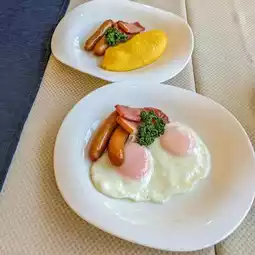 🍳For breakfast, a hearty Western breakfast is provided. It includes a variety of options such as hot bread, omelette, bacon, fruit, coffee and more.