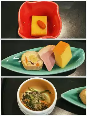 ✅Dinner is a set meal. It was ready when we arrived. It was richer than breakfast, including appetizer platter, salmon, fish cakes, grilled fish, shrimp, abalone, beef tenderloin, steamed egg custard, sukiyaki, miso soup, rice, Hokushu plum wine, fruit dessert after meal, etc.