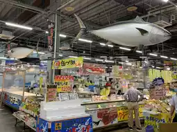 Toretore Fish Market, the largest seafood market in western Japan, is located in Shirahama, Japan. While not very large, it offers a wide variety of seafood. Salmon are dissected daily. The market features live fish, dried goods, and a barbecue area.