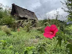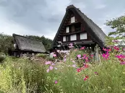 My place from the middle position walked to a called Ogimachi Park, very simple only a piece of grass, a few lounge chairs, sit down all around the distant mountains, up close is the characteristic hut, are really quite relaxing. Continuing to walk to the right, there are basically photo spots everywhere, after passing Mingzenji Temple, Gassho Cultural Center, Shirakawa-go Hachiman Shrine, the scenery that appears in front of you is as beautiful as a postcard, sporadic large cosmos, varying shades of pink white flowers, with matching special Gassho hut.