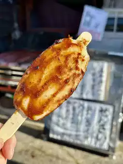 grilled rice balls, pork skewers, gohei mochi, etc.