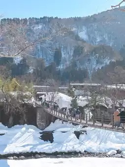 A large suspension bridge at the entrance to Shirakawa-go! Crossing the long suspension bridge leading to the Gassho-style village is a thrill🚶➡️❄️