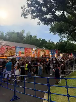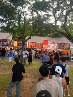 The festival takes place on the expansive lawn in front of Nihondaira Hotel. On the day of the event, dozens of food stalls participate, offering grilled skewers, roasted squid, fried chicken, and refreshing drinks to satisfy the thousands of attendees. Notably, イカ焼き (grilled squid) is a staple that is never absent from Japanese festivals.