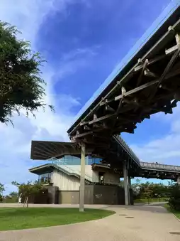 Let's start with the Nihondaira Dream Terrace, a public space designed by renowned Japanese architect Kengo Kuma and opened in 2018. The structure extensively uses Shizuoka wood, and staff explain that its design was inspired by the Yumedono Hall of Horyuji Temple. This influence is evident in the frequent use of octagonal shapes throughout the design, from the main building to the extended wooden walkway viewing area and the outer observation deck.