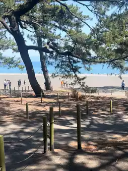 Miho no Matsubara Beach is located in Shizuoka, Japan. 🌊 It boasts a spacious parking area, a popular spot for relaxation. There are also shops and restaurants. The entrance is lined with rows of over 30,000 pine trees, stretching over 7 kilometers, creating a lush and shady atmosphere. Some of the pine trees are old and their trunks are stunningly beautiful.