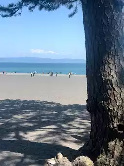 It's also one of the best places to see Mount Fuji from the shore. If you visit during a clear day, the view is stunning. Tourists here include both Japanese picnickers and children playing in the water, as well as international visitors. The water is crystal clear and gentle, making it perfect for swimming.