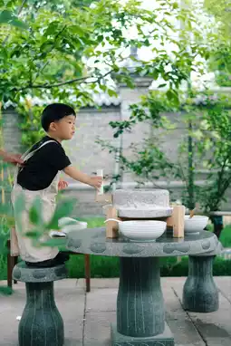 Played in the pool, tasted tea in the teahouse, ground soy milk on the stone mill...