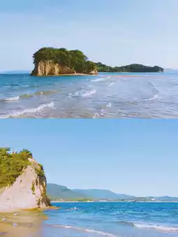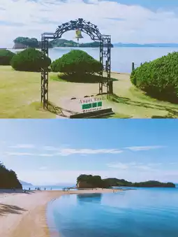 ➡️Finally, return to the Shodoshima International Hotel, where Angel Road is located. With the ebb and flow of the tide, the sandy path to the small island in the sea appears and disappears, and it's only accessible at specific times each day, making it a popular path of love for many couples.