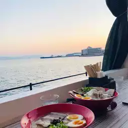 Ramen Hishio is famous for its Shodoshima soy sauce ramen. The broth is made from pork and chicken bones, combined with seafood broth made from dried fish from the Seto Inland Sea. The key ingredient is the locally produced Shodoshima soy sauce, which gives the ramen a rich and unique flavor without being greasy. 😋 You can enjoy the ramen while sitting at a seaside table, taking in the beautiful sunset over the Seto Inland Sea. It's a fantastic experience. 🌟