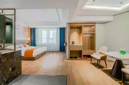 The hotel is built to three-star standards, with a spacious and bright lobby featuring warm yellow lighting and wooden decor that immediately puts you at ease. The front desk staff are very welcoming. We stayed in a business king room, which was spacious with soft bedding that instantly relieved the fatigue of exploring the ancient temple. The bathroom had a separate wet and dry area, complete toiletries, and even a high-power hairdryer, perfect for drying long hair.