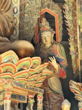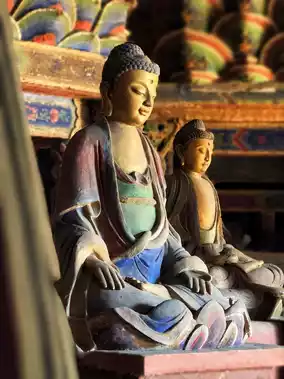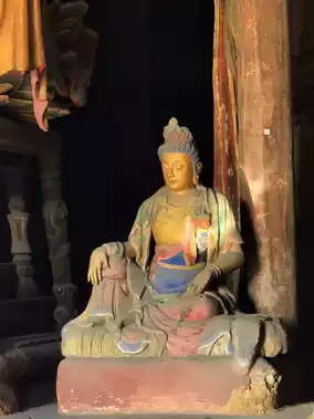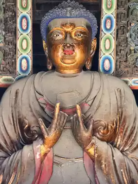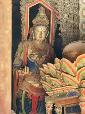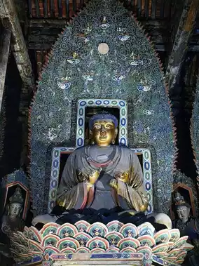 The Hall of Amitabha at Chongfu Temple, a sacred hall frozen in the Jin Dynasty. Seven Jin Dynasty statues within the hall (one Buddha, two Bodhisattvas, and four attendants) narrate the splendor of Liao and Jin Buddhist art with their majestic presence and delicate charm.