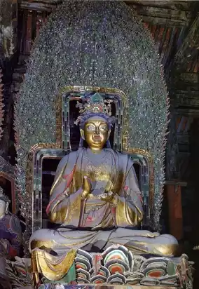 The principal statue, Amitabha Buddha, sits in the lotus position, his downcast eyes revealing a divine compassion for all beings. The cascading folds of his robe resemble flowing water, and the gilded ornamentation, though aged, still hints at its former brilliance, showcasing the Jin Dynasty's ultimate pursuit of "depicting the spirit through form."