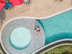 The hotel's swimming pool is divided into a children's and adult pool. The sunrise view from this angle is beautiful. 🌊🏊♀