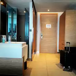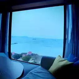 The room in the hotel is an ocean view room. Large glass, no balcony, beautiful sea view, can see all around.