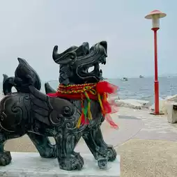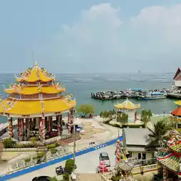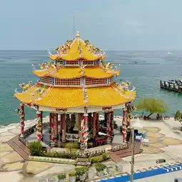 A monastery with a long concrete bridge that extends to a tourist ferry pier across the island. The temple area looks like a cape jutting out into the sea. It is a sacred Buddhist site by the sea, combining Thai and Chinese styles.