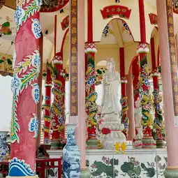 On the lower part of the temple's seaside courtyard, there is a large statue of Goddess of Mercy in the posture of bestowing blessings for worship to bring good fortune to ourselves.