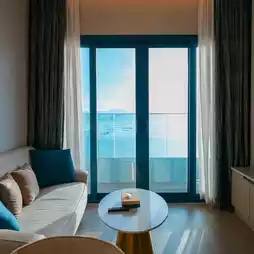 As for Fern's room, it is a 1 Bedroom Suite, a 46 sq.m. room that is well-proportioned. There is both a bedroom and a living room with a full sea view. With a balcony for you to go out and breathe some fresh air The bedroom is connected to the dressing room. The bathroom comes with an automatic toilet and a bathtub. There is a kitchen area, a dining table, a gas stove, a microwave, a refrigerator, and a washing machine. This is a hotel that is suitable for staying for 1-2 nights and is also suitable for a long staycation.
