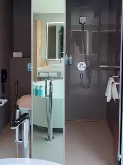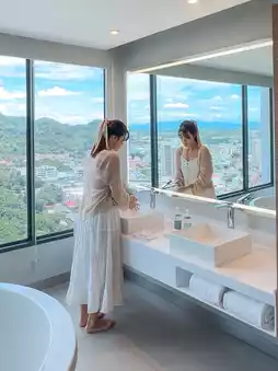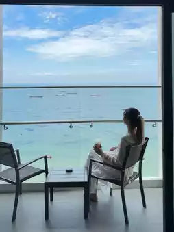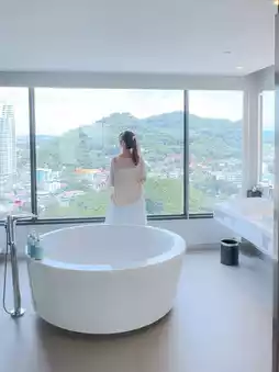 One side is a balcony where you can walk out to see the sea view of Sriracha and the floating island at 180°. The bathroom side has a large mirror with a bathtub that can also see the city view of Sriracha at 180°.