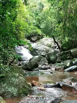 Chan Ta Thoen Waterfall is a medium-sized waterfall located deep in the forest, featuring five tiers where water cascades over large rock formations into pools below.