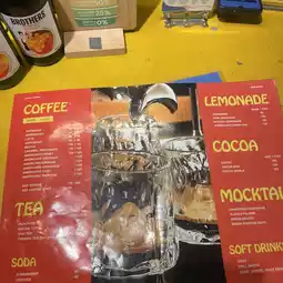 This cafe serves drinks, food, and pizza.