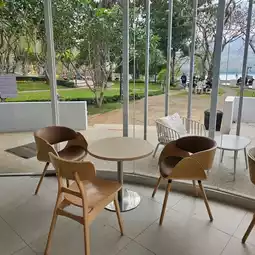 Khun Sai Chon Coffee Shop is another branch of a coffee shop with a great location and a beautiful view. It is located above the Srinakarin Dam. The shop is designed in a minimalist style, decorated in white. There are a variety of drinks, snacks, bakery goods, and ice cream. The inside is an air-conditioned room, suitable for sitting and watching the view of the water on the dam, making you feel very relaxed. No matter how hot the weather is, there is still air conditioning to sit and sip coffee and enjoy the view. But if you come during the rainy season, you will get the atmosphere of rainy weather, sipping coffee, and light fog floating above the dam. The vibe is very good.