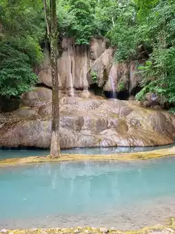 Erawan Waterfall is an unseen that is worth visiting. It is beautiful with 7 levels of waterfalls. The higher you walk, the more beautiful it is. It is clear and inviting. The atmosphere is good throughout the journey. However, there are quite a few people. The toilets are clean. The entrance fee is 60 baht per person and 30 baht for a car. There is a field where you can contact to set up a tent. There are many restaurants along the way. The parking lot is spacious. Currently, there is a golf cart that will take you to the waterfall so you don't have to walk until you are tired. It is very beautiful and natural, which is great for those who love hiking and taking pictures.