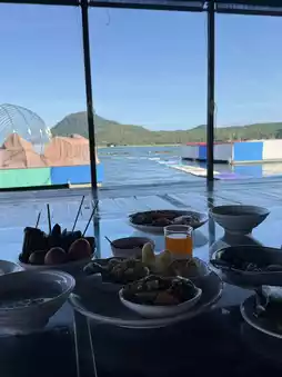 Accommodation with water slides at Srinakarin Dam, Kanchanaburi. I have to say that it's very worthwhile, extremely worthwhile. The price is in the thousands, but it includes 3 meals and accommodation. There were about 12 of us staying on a raft in the water. For those who get seasick, you can choose to stay on the top, but we stayed at Ban Pla Kaho, which is on the edge, so it didn't feel like it was rocking at all. Plus, there's a dining area. The resort provides 3 meals: lunch, dinner, and breakfast. The food line is very plentiful. They keep refilling, so you don't have to worry about running out. Around 4:30, we'll take you on a wet raft to the middle of the dam. There's not much to do, so when we get back, we continue playing on the water slides. We cycled until around 5:30, when they'll turn off the equipment so you can go upstairs to shower and eat dinner. There's also a plethora of dinner lines, which are different every meal. There's also a live band in the evening. Sit back and enjoy the music, or you can go back and sit in front of the house and chill. I liked it so much that I want to go eat again. #Kanchanaburi #GetDiscountsNotDependingOnLuck