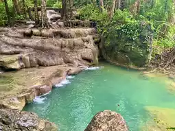 Located about 130km from Bangkok, Erawan National Park, known for its beautiful nature and waterfalls, is a popular day trip destination. The seven-tiered Erawan Waterfall features clear, emerald-green water that's suitable for swimming.