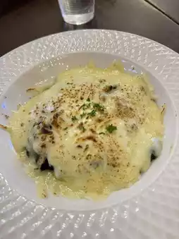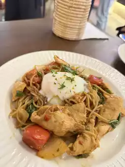 🌟 Another menu we ordered was baked spinach with cheese and spaghetti with drunken chicken and onsen eggs.