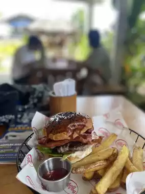 Later, I headed to a stylish, open-air café with a cozy, rustic vibe. The atmosphere was laid-back, with ceiling fans gently swirling to keep things cool. I enjoyed some quality time with friends, sharing stories and laughter over hearty meals. The highlight was a mouthwatering burger with crispy fries—pure comfort food in the midst of paradise.