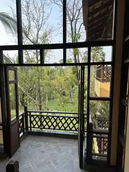 This resort is really attractive with modern and wooden room decoration. The surrounding area is green.