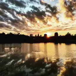 As the sky awakens in hues of gold and crimson, Angkor Wat emerges from the mist, its grand towers silhouetted against the rising sun. Walking through the ancient remnants, every weathered stone whispers stories of a glorious past, a testament to Khmer heritage. The reflection in the lotus-filled moat is pure magic—an unforgettable moment of serenity and awe. A timeless wonder, forever etched in memory.