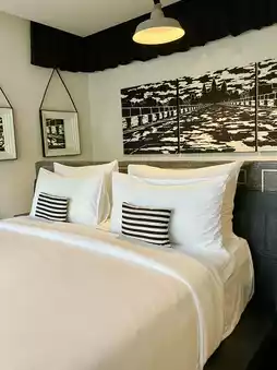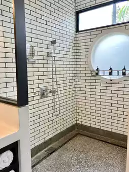 The interior of the hotel is monotone black and white, with orange as an accent color. The unified color scheme of the building highlights the beautiful green of the garden🌴