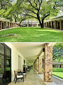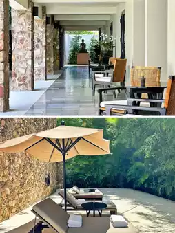 The dining experience is equally exquisite~the circular restaurant serves authentic Khmer flavors, while the open-air terrace offers Western cuisine, all enveloped in a temple-like serenity. Though compact, the resort is fully equipped~with twin pools, a gym, spa, and immersive cultural experiences like temple visits by bicycle. Design-wise, tranquility reigns supreme, with whitewashed buildings and lush courtyards forming a secluded oasis that echoes the ancient mystique of Angkor Wat.