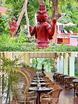 Sofitel Angkor Phokeethra Golf & Spa Resort perfectly blends Khmer traditional art with French elegance, with particularly exquisite room designs. Handwoven Cambodian silk cushions complement vintage French furniture, while some suites feature private balconies overlooking the Angkor ruins, with teak floors and red clay pottery bathrooms showcasing local charm. The dome murals in the Royal Suite replicate the floral reliefs of Banteay Srei, allowing guests to immerse themselves in the beauty of Angkor civilization even during rest.
