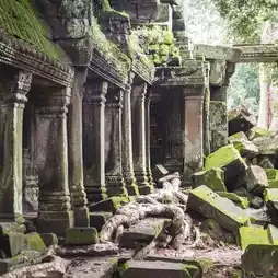 This temple was engulfed by the forest after the fall of the Khmer Empire, leading to its structures being overtaken by vegetation and gradually collapsing. Today, it remains open to the public in its original state, allowing visitors to walk along wooden pathways set amidst the rubble. 🌳