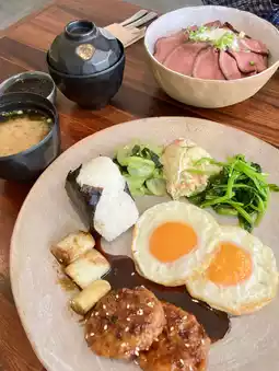 The balance of flavors in the ohitashi (boiled greens) and vinegared vegetables served with the rice balls was truly Japanese. 🍙
