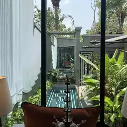 Starting from the entrance door, it is decorated with a pattern of the hands of King Jayavarman VI in meditation. Using ancient door locks Decorated with magical photographic paintings Amidst a tropical garden, it gives the feeling of walking into the Angkor Wat area But combined with modernity by using stripes and dark-colored furniture. All designed by Bill Bensley, a designer who has left his work in luxury hotels around the world.