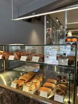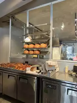 The counter bar and the semi-open kitchen at the back offer a view of the fragrant bakery kitchen in an open-air glass room, showcasing the bakers' delicious creations.