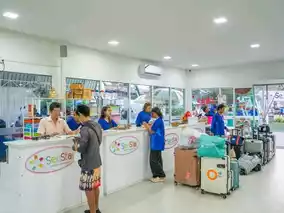 Photographers who are lost in the sea must not miss this place. No matter how strong the sun is, we are ready to fight with all our hearts. The sky is beautiful. The white sand is soft and comfortable to the feet. The reception area of Thap Lamu Pier offers food, drinks, snacks with cool air conditioning. Tables to sit and eat snacks both outside and inside. Fun equipment, underwater cameras for rent or borrow, clean bathrooms, and a team of guides are ready to serve everyone.