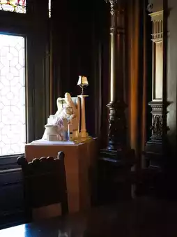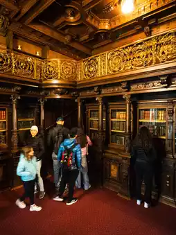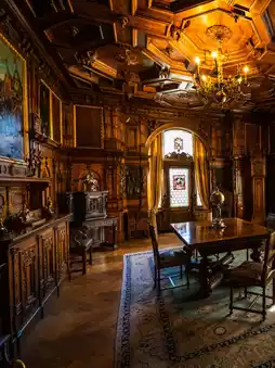 As we enter the library, we are greeted by over 10,000 books lined up on the shelves. The atmosphere is tranquil, yet each volume tells a story of the past. The walls and wooden pillars are intricately carved, especially the "Green Man," a medieval nature god carved into the moldings. This serves as a reminder that despite the luxurious palace, nature is always watching. This library reflects King Carol I's desire to make the castle a "home for readers," rather than simply a royal residence.