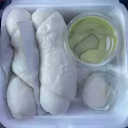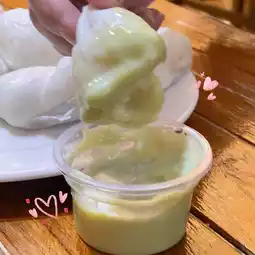 🤍 Mantou, Pae's shop has the best flour, so it sells only flour. You get 2 long pieces of pure steamed bun flour (mantou) with pandan custard and fresh milk, 35 baht per set