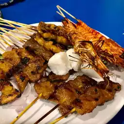 A local seafood stall in Singapore in Binhai Bay Gardens, in a corner of the garden, online recommended authentic food place, special trip, through the garden, then along the shore walk, distance and secluded, looking for a while, finally arrived at the satay by the way sign.