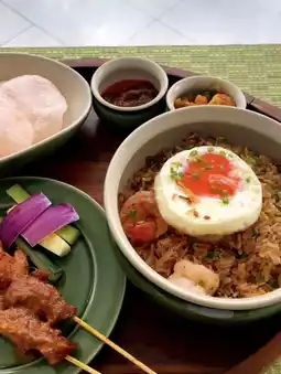 Experience lounge poolside with Raffles Hotel's iconic Singapore Sling in hand and my satay fried rice lunch..