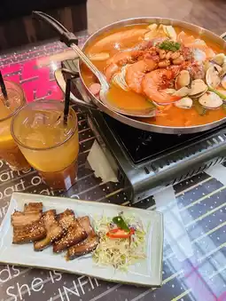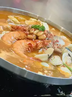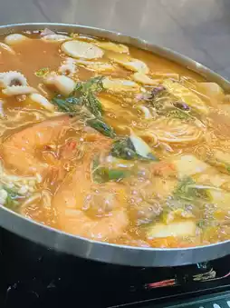 👍🏻⭐️⭐️We had “Spicy Seafood Army Stews” for our dinner, it comes with seafood – clams, octopus and prawns, also there’s sausages, tteokbokki, luncheon meat in it. It’s served with hotpot – keep the foods warm during dining.
