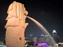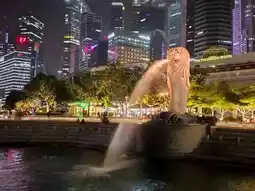 The Merlion and the water around it are illuminated with light, creating a beautiful night in Singapore🌃