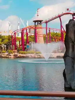 Notable attractions include the 🎢 Battlestar Galactica dueling roller coasters