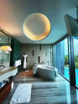 ❣️ Needless to say, the room is very luxurious and beautiful, many large floor-to-ceiling glass, great view, and a hanging chair 😍. The bathroom is very spacious and elegant, very exaggerated. All supplies are complete.