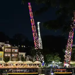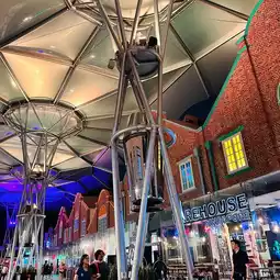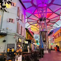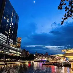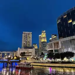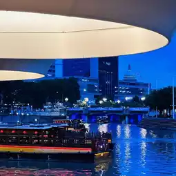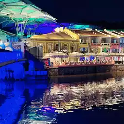 As night falls, Singapore's Clarke Quay transforms into a magical world of light and shadow. The Ferris wheel towers into the clouds, like a huge bright lamp, lighting up the entire harbor. The skyscrapers with flashing lights cast brilliant light, reflecting on the tranquil sea, like a magical crystal palace. Cruise ships shuttle through the area, bringing laughter and a romantic atmosphere. Melodious music floats in the air, complementing the lights to create a charming atmosphere.